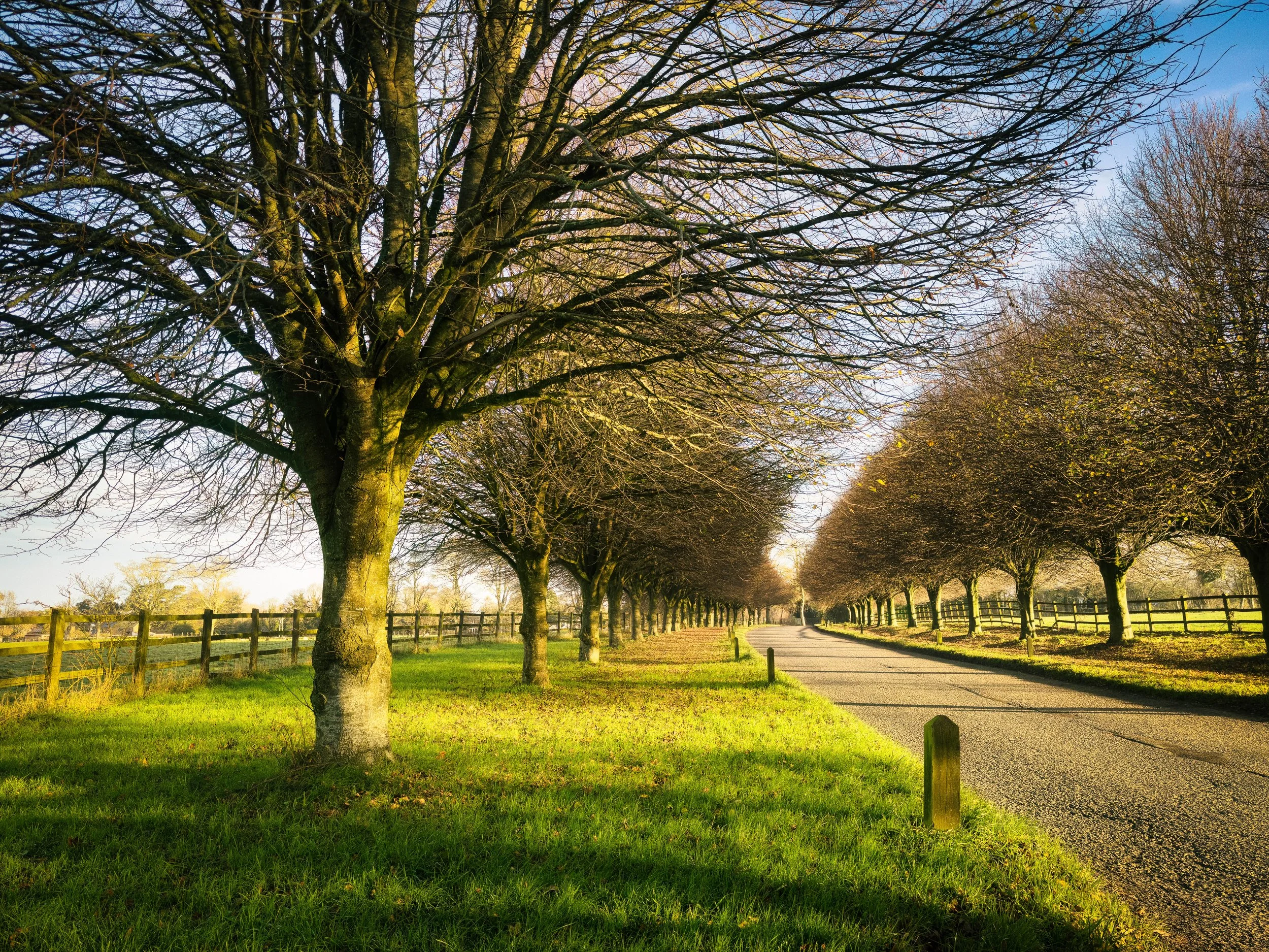 Tuesday. It’s a sunny, wintry day—clear skies but really cold, only 2°C when Dash and I left for the school run. Cars along our street were well and truly iced up, and I joined several of my neighbours busily scraping windscreens and warming their engines. On the way home, the light was gorgeous. I stopped in Coldred to photograph the avenue of trees leading into the village. This scene has appeared in my blips several times already, but with seasonal changes and the dramatically shifting weather, it continues to surprise.
