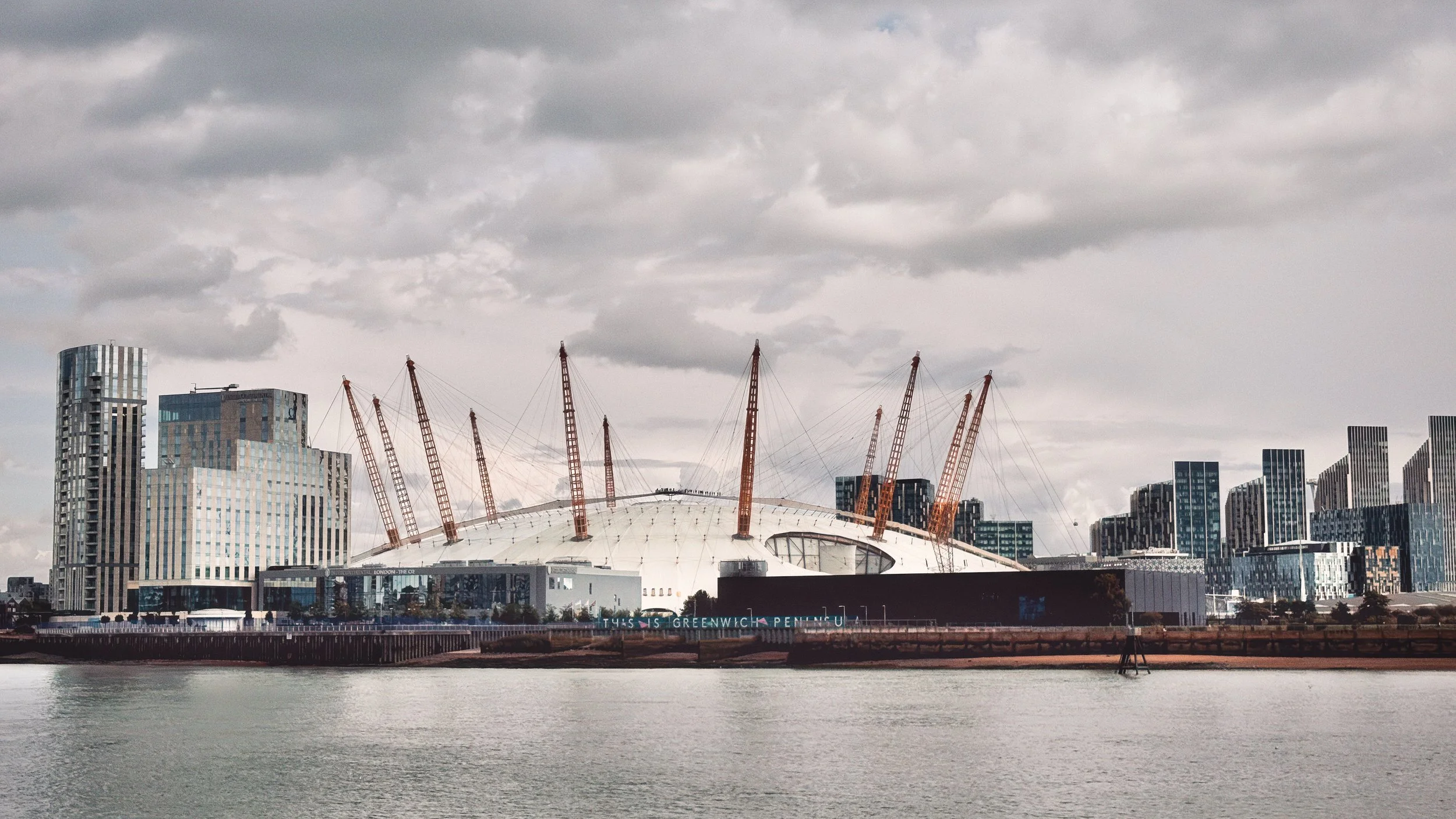 The route loops west around the tip of the Isle of Dogs and down the south side of the river past the O2 on Greenwich Peninsula. The O2 — originally the Millennium Dome, built to house the Millennium Experience exhibition and opened on 31 December 1999 — sits on a former gas works site that was one of the most contaminated in Europe before its remediation in the 1990s. The dome structure itself, designed by Richard Rogers and engineered by Buro Happold, is 365 metres in diameter and 52 metres high at its peak, its twelve yellow support masts corresponding to the months of the year. Its commercial reinvention as a live music and entertainment venue from 2007 onwards has proved considerably more durable than its original purpose, and from the south bank of the river the scale of the thing — the white roof, the masts, the surrounding towers of the Peninsula development — is properly impressive under a stormy August sky.