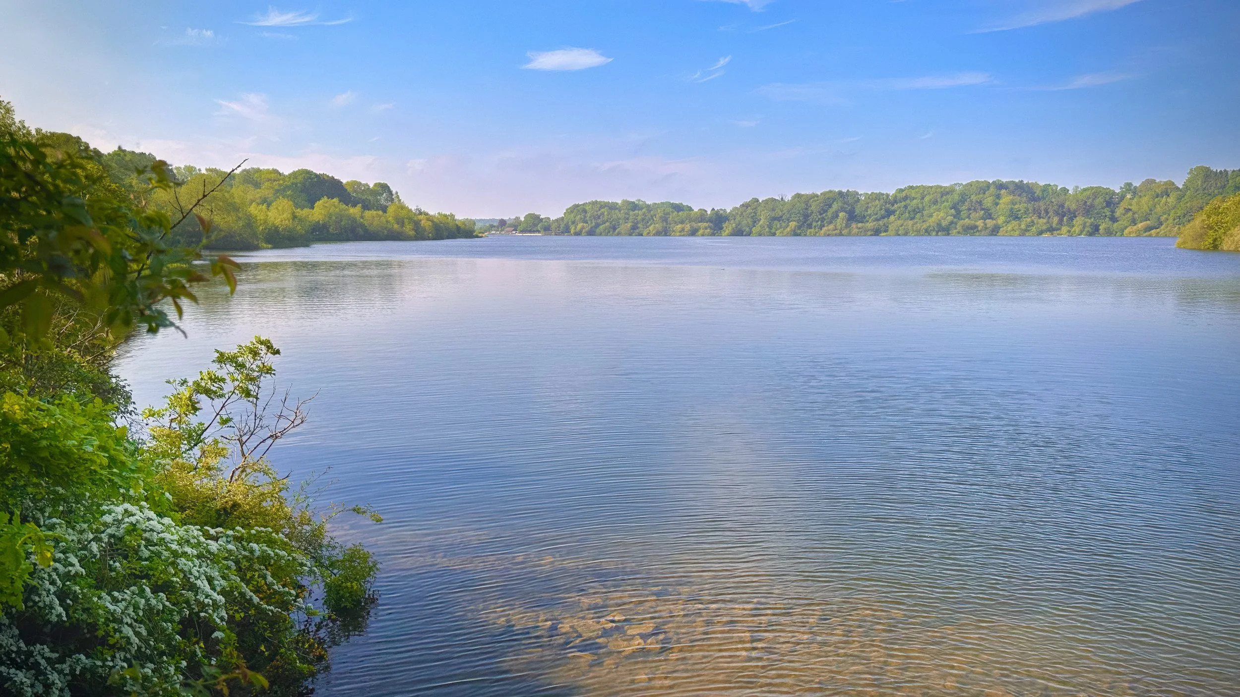 Roughly ten kilometres in, the route passes alongside Ardingley Reservoir, valley of the High Weald between the villages of Ardingly and Balcombe. The reservoir was created in 1979 by damming Shell Brook, a tributary of the River Ouse, flooding the lower ground of the valley to form a body of water covering 74.5 hectares. Before the dam was built, the site held an iron forge and a fulling mill — the name Fullingmill Wood, which still stands at its northern end, is the surviving indicator of a textile industry that operated throughout Sussex from the late twelfth century to the late nineteenth. The path along its eastern shore is part of the Kingfisher Trail, and on a clear May morning with the water glassy and the banks in white hawthorn blossom, it is one of the better stretches of the route.