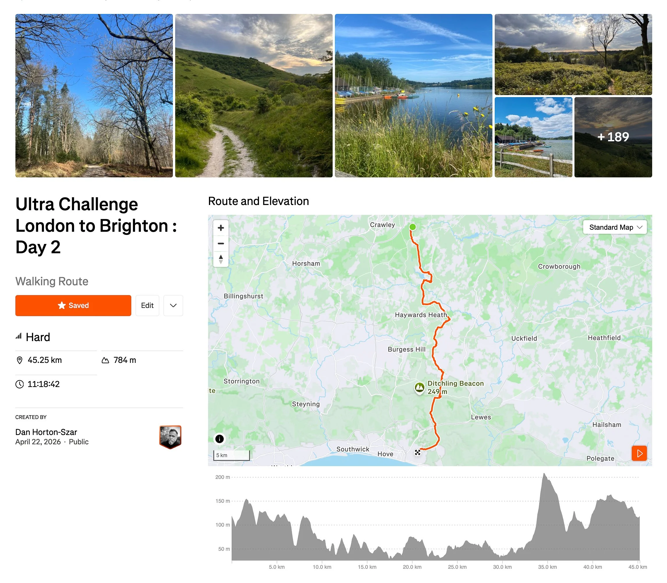The second half of the route covers 44 kilometres from Turners Hill across the High Weald and over the South Downs to Brighton Racecourse. Day 2 actually carries slightly more elevation gain than day one — 765 metres against 708 — which is not immediately intuitive given that the finish is at the coast. The reason is the South Downs scarp, which rises sharply from the flat Weald floor and has to be climbed directly before the descent into Brighton. The legs already carry 58 kilometres from the previous day; the hills on day two do not feel smaller for it.