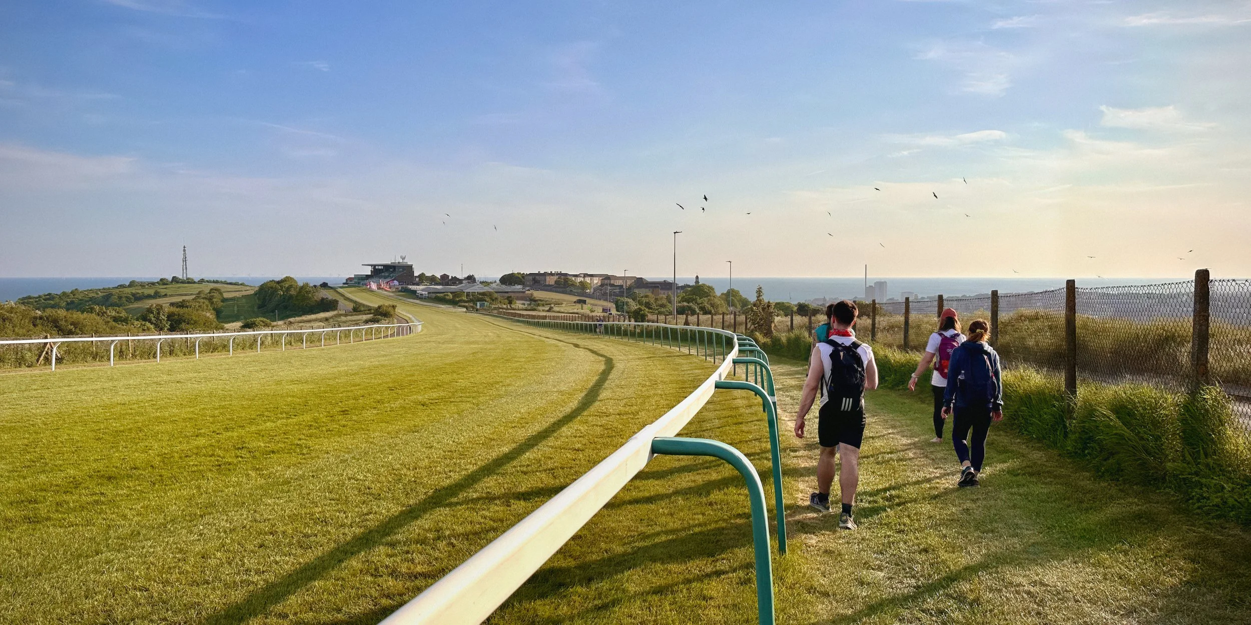 The final section from Ditchling follows the ridgeline east before descending through Woodingdean on Brighton's eastern edge and into the racecourse from the north. By this point Sophie had developed serious blisters and completed the last few kilometres barefoot — not quite as drastic as it sounds, given that the finish is on the fully turfed ground of the racecourse itself, but it is the kind of detail that says something about the distance. The path along the racecourse perimeter fence, with the grandstand and the sea just visible ahead, is the point at which the end becomes genuinely concrete: the Channel on the horizon, swifts overhead in the evening light, and the finish line close enough to count down to.