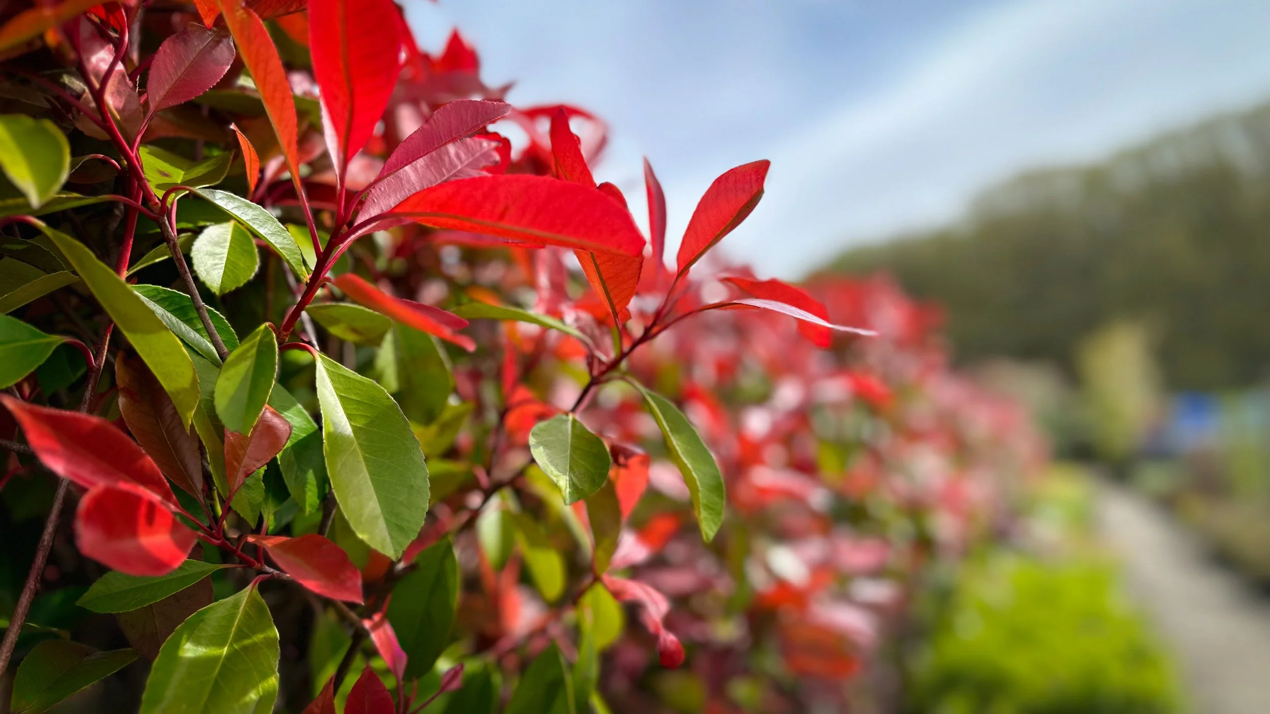 Sun and blue skies today, quite a contrast after yesterday's downpour. I'm off work again this week so I've been doing some gardening. I drove out to Maytree Nursery near Faversham, looking for a lime-green Heuchera plant to fill a particular spot in the raised beds – the garden centre we visited yesterday didn't have one. Leaves and flowers were glowing with bright colours in the morning sun, so I took several shots. I like this one the best with the bright red Photinia leaves against the blue sky. We have several of these in our garden, as they thrive despite Windy Whitfield's weather. This variety, Red Robin, is very popular, but they have come to be affectionately known as 'Reliant Robin Trees' in our family.