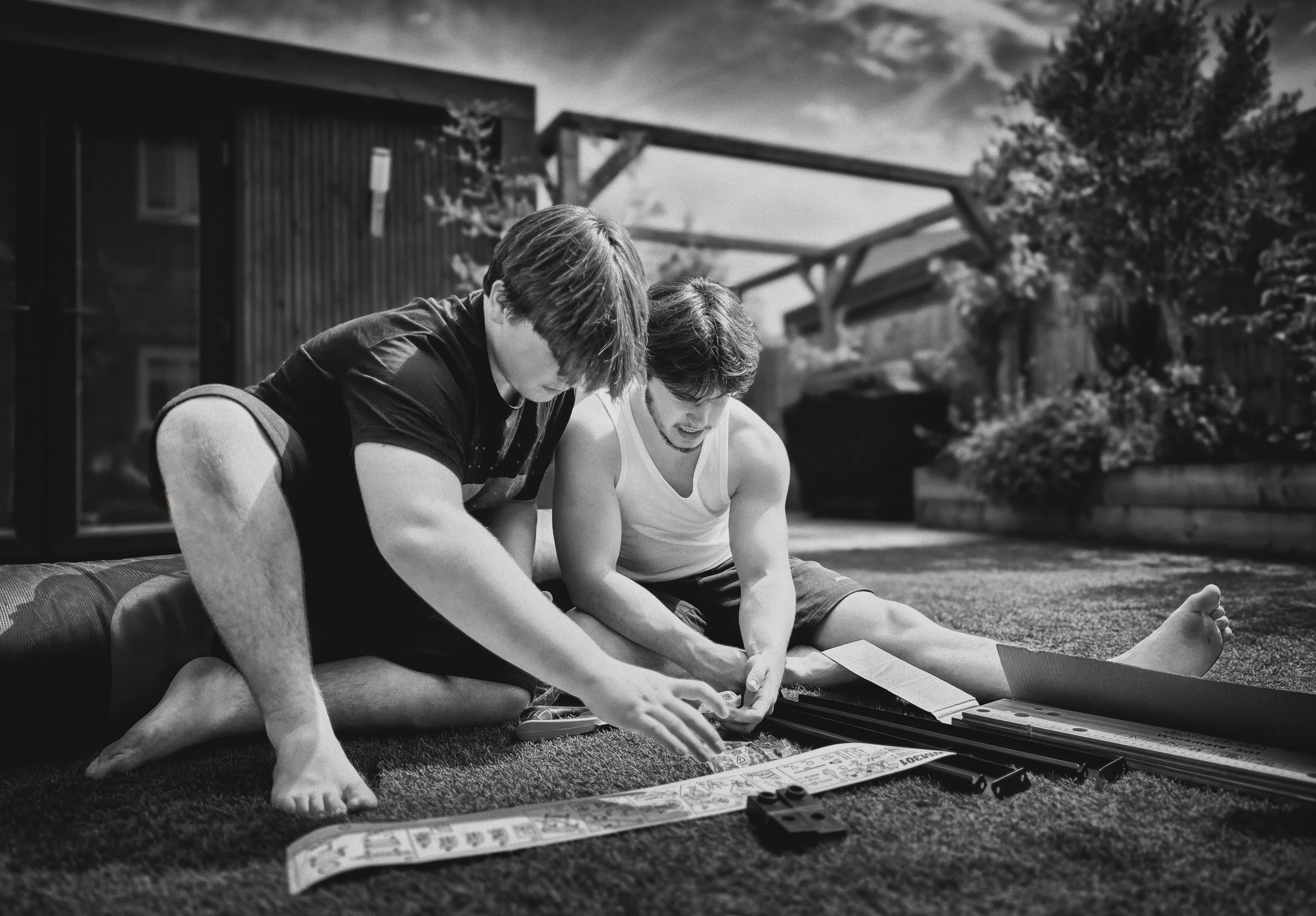 What a wonderful Saturday! I’m off work for two weeks now, which in itself is sufficiently awesome and cause for celebration – but it’s also the weekend of #1 son Raff’s 23rd birthday. We’re having a bit of a family gathering, which begins today. The weather is perfect today – warm and sunny but not too hot – so everyone spent the afternoon in the garden, eating, drinking and chatting. Dash has been getting very interested in woodworking lately, which is excellent, and we are keen to encourage his creativity. He is also a messy little sod at times, too, and we are equally keen to avoid random drill holes and saw marks on the garden furniture! We picked up a basic Black + Decker workmate bench from B&Q this afternoon to help solve this problem, and I took this picture of Dash & Gubs assembling it on the lawn.