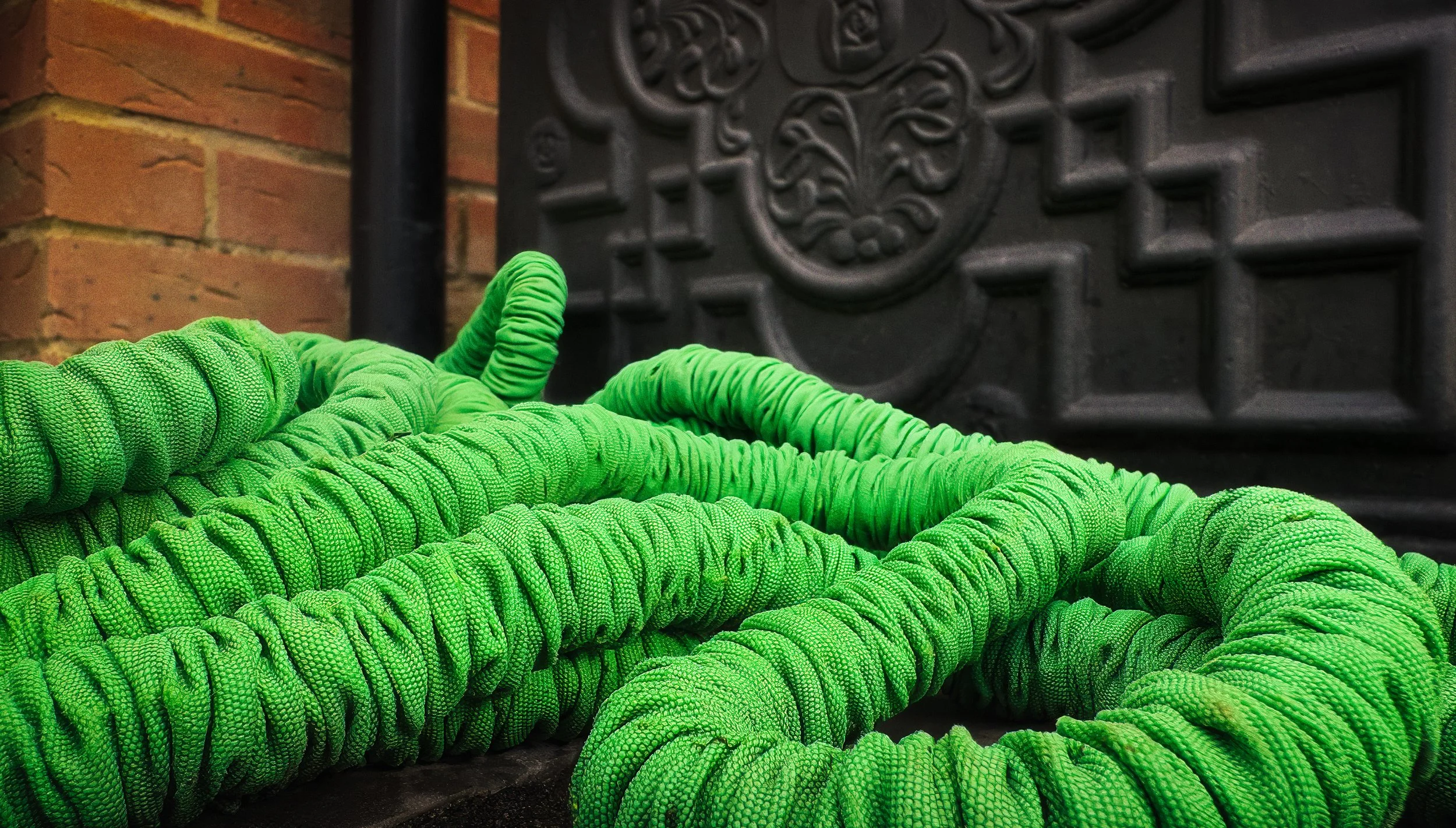 Monday morning arrived all too soon, and with more rain – the wintery weather seems well set in. I knew the day ahead would be busy, so I decided to catch the early light and hunted for blips in the garden. Rain-soaked surfaces glistened, and colours glowed; I spotted this bright green hosepipe coiled in a corner – no longer much use after Dash managed to explode it during one of his ‘experiments’. I really do need to get a new one.