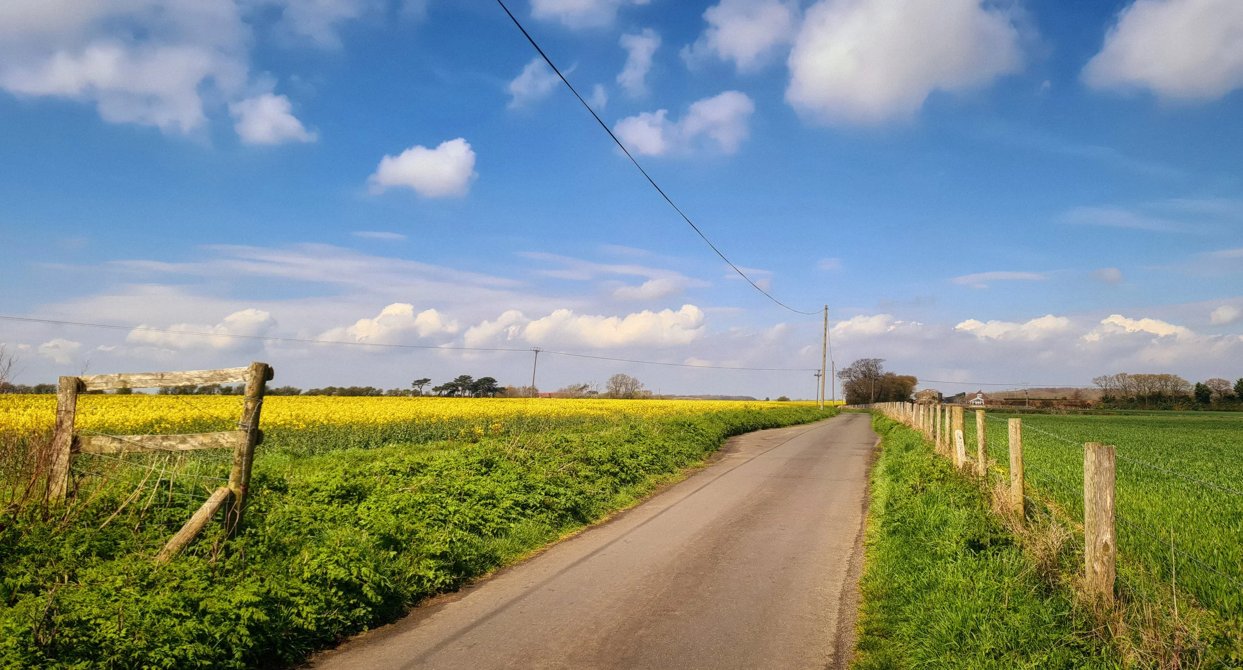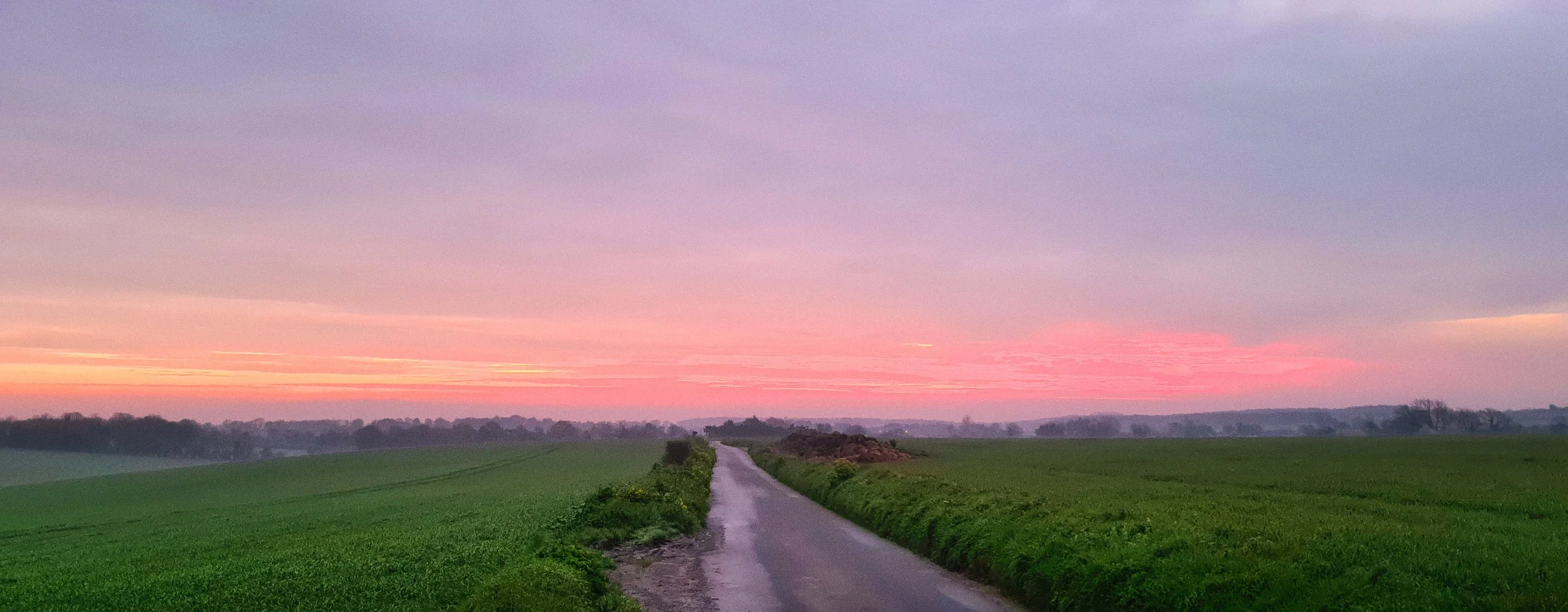 The light changed somewhere around Guston, as the sky began to separate from the land. The cloud thinned to the east and what came through was not the hard yellow of full sunrise but something softer — pinks and mauves running along the horizon above the fields, the lane narrowing to a pale strip between the crops. The rapeseed on the left was already in full flower, an intensity of yellow that absorbed the pink light and threw it back differently. It was the kind of light that lasts for perhaps twenty minutes and is gone before it has fully registered.
