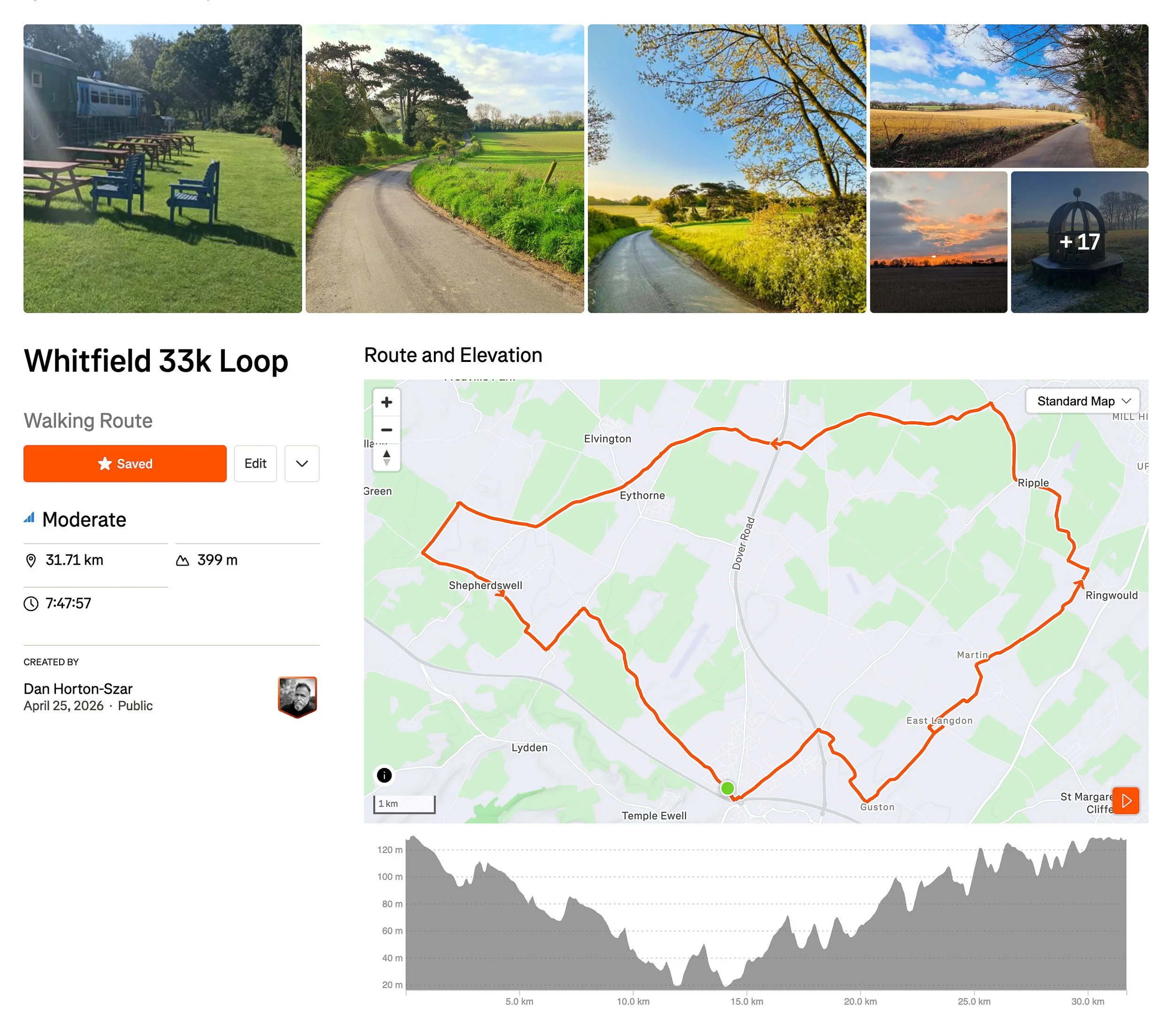 Back at the northern end of Singledge Lane, approaching Whitfield from the south through rapeseed fields bright against a now properly blue sky, the 33km objective was more or less accomplished. Moving time was 6 hours 26 minutes across 33.51km, with 403 metres of elevation — undulating rather than severe, the landscape of the east Kent plateau rolling steadily rather than climbing in any dramatic way. Total elapsed time of just over eight hours reflects some time spent with the camera.