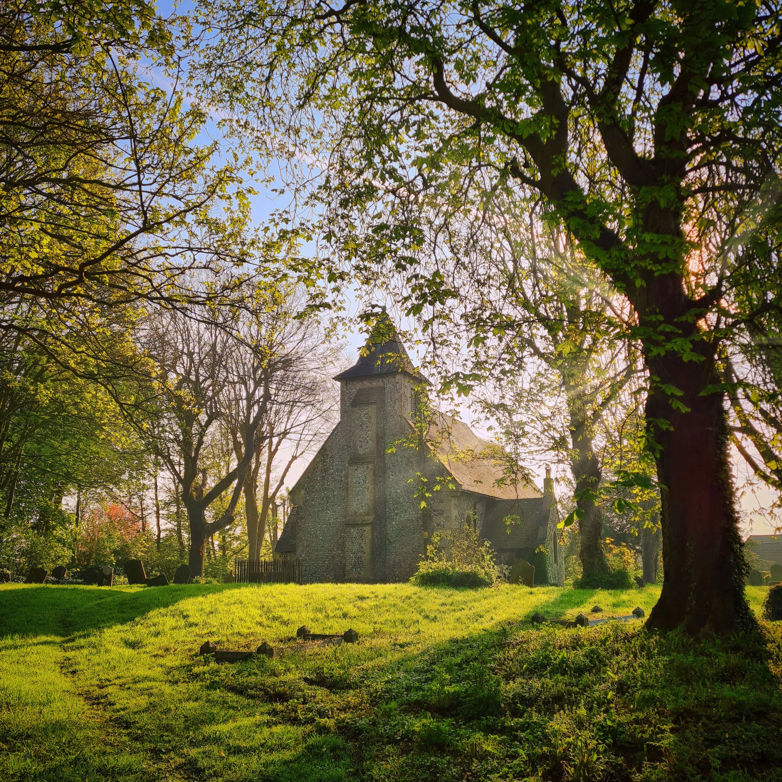 Guston itself is small — a scatter of houses, a handful of farms, and the church of St Martin of Tours, which has stood near this road since around 1090. The Domesday Book records the settlement as Gocistone, meaning Guthsige's village, and the name has been wearing away ever since into the softer single syllable it carries today. The church was built within a generation of the Conquest and has changed less than most of its contemporaries, partly through the involvement of the monastic orders and the Archbishops of Canterbury, who held the living for centuries. Three Norman windows survive in the east wall. The Victorian restoration, as elsewhere in Kent, left its mark — the stained glass in the south nave window is twentieth century — but what you see in the low morning light, framed by the churchyard trees with the sun still low and oblique, is a building that belongs to its landscape in a way that the more heavily restored village churches sometimes do not.