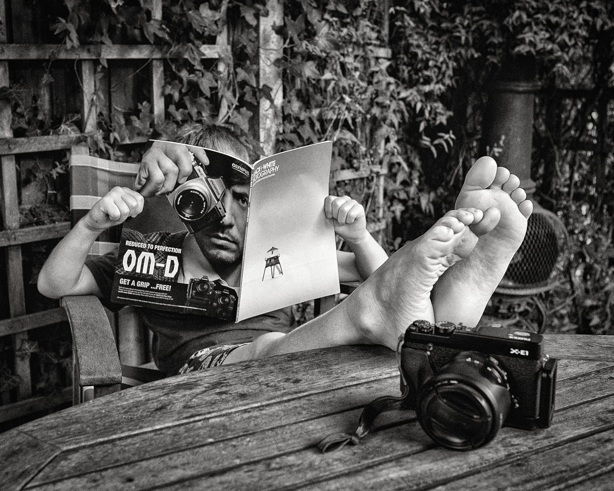 Milo and I had fun with this one. The spontaneous part was that I came back out into the garden to discover him sitting in my chair, completely engrossed in my photography magazine. That gave me the idea for this photograph, but it wouldn't have worked as a candid because of the angles and cluttered background.