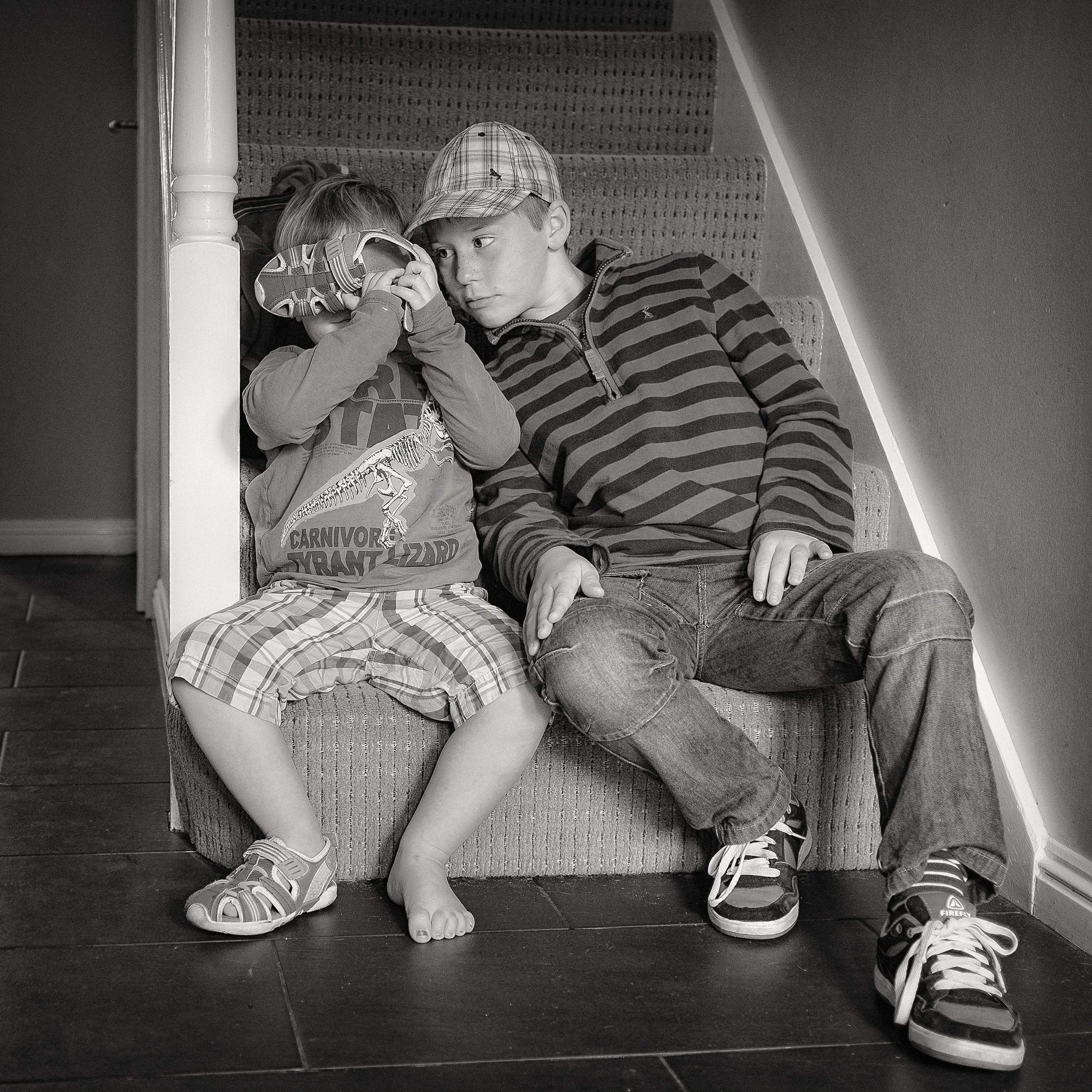 Amid the noisy kerfuffle of the school-run hustle this morning, I spotted this lovely moment. Dash is pretending to hide behind the shoe so that he can’t see his big brother, while Milo is trying to stare at him from the side until he gives in and looks around. I think this must be more fun than it sounds because Dash finds it hilarious...