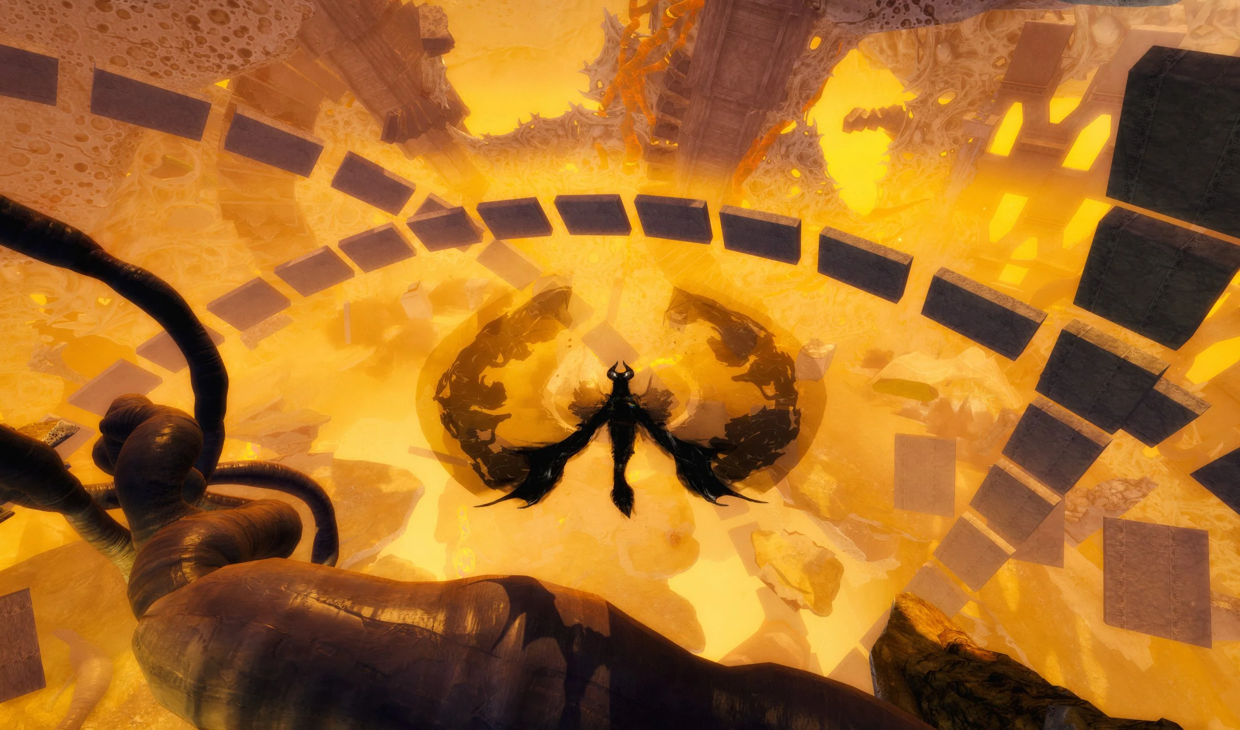 “Traversing the Titan”, the map’s jumping puzzle, pulls all of this into a single long climb and sidestep through the Titan’s interior. The entrance lies south of Hidden Nodule Waypoint, behind a translucent barrier that can be passed only when the nearby Mursaat Mirror is active, reinforcing the idea that you need Mursaat technology to enter the Titan’s body fully. From there, the route winds across snapping‑point masonry, floating debris and organ‑like surfaces: a long sequence of horizontal runs, sharp vertical rises, and lateral detours that see you clamber up a toppled bookshelf, cross a chain of square platforms bolted into a strand of tissue, and pick your way along narrow ledges at the map’s edge with organ cavities yawning below. It is a substantial piece of platforming by Guild Wars 2 standards, taking several minutes even with a clean run, and the chest at the end is required not only for the “Traversing the Titan” achievement but also as a component of the Bava Nisos Mastery meta and thus of the Askur Camping Cookout backpiece, which leads into the Orrax Manifested legendary backpack.